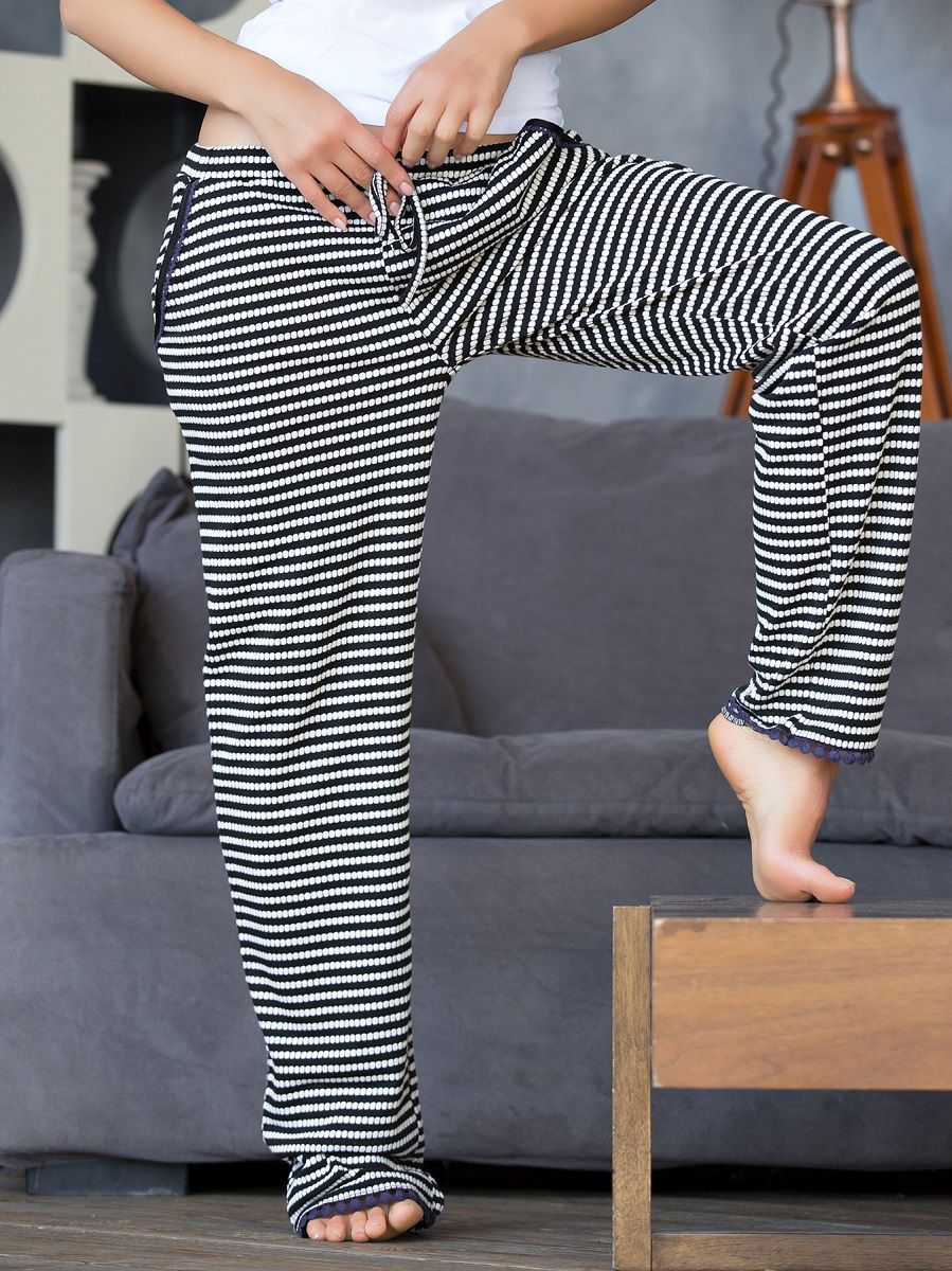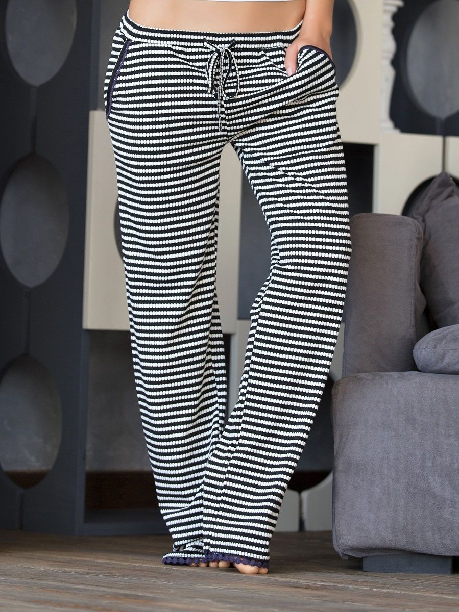 Безупречные домашние брюки свободного кроя. Резинка на поясе и удобные боковые карманы - незаменимые атрибуты идеальных домашних брюк. Выше всяких похвал комплект с простой белой майкой, навевающий мысли о море и прекрасном курорте.