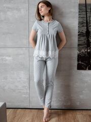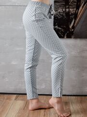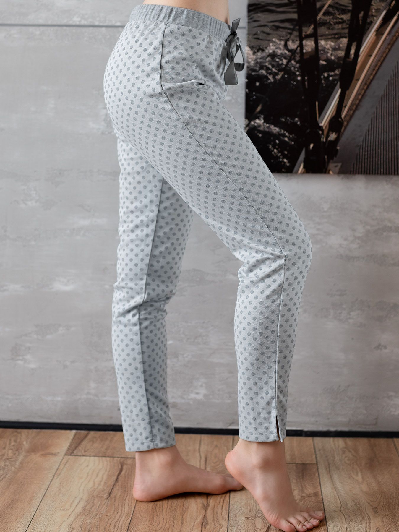Домашние брюки на резинке, зауженные к низу, длина 7/8. Выполнены из мягкого плотного трикотажа с рисунком «горошек», образованным сочетание двух оттенков серых нитей. Дополнительное очаровательное украшение – атласный бант в поясе.