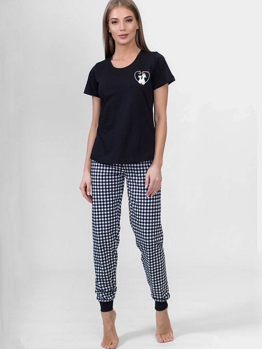 Трикотажный комплект. Футболка из однотонной ткани с принтом, с коротким рукавом, брюки свободного покроя в клетку, на манжетах. В комплекте: футболка, брюки.