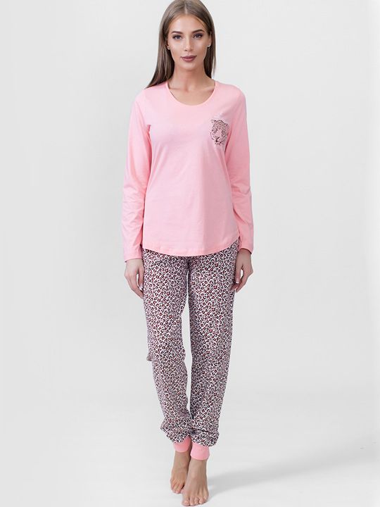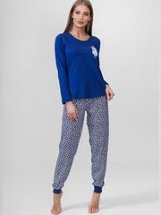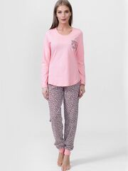 Трикотажный комплект. Футболка из однотонной ткани с принтом, с длинными рукавами, брюки свободного покроя, в мелкий рисунок, на манжете. В комплекте: футболка, брюки.