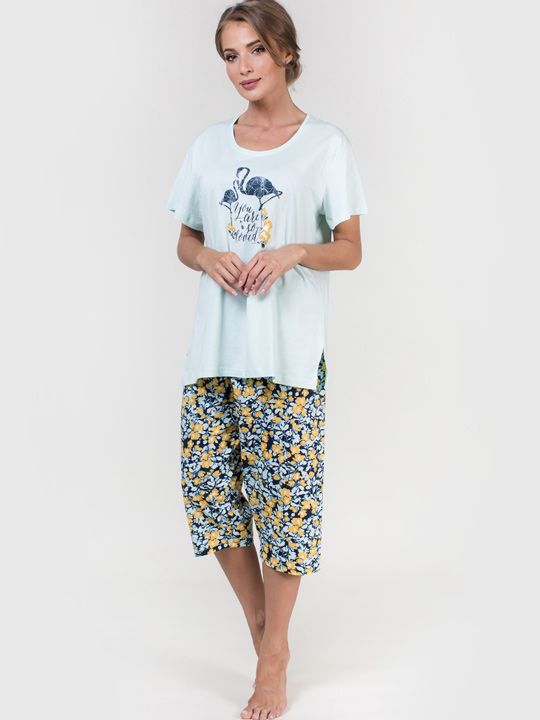 Трикотажный комплект. Футболка с коротким рукавом, однотонная, впереди с принтом, капри прямого покроя с рисунком. В комплекте: футболка, капри.