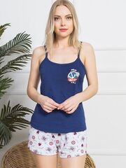 Женский домашний костюм в морской тематике. В комплект входит однотонная майка на тонких лямках и шорты с узором. В комплекте: топ, шорты.