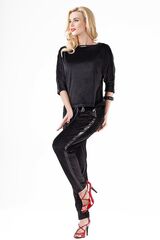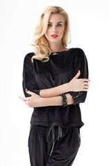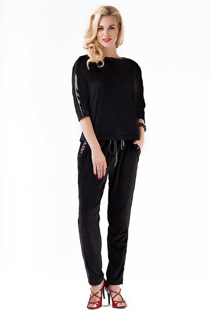 Стильный домашний костюм из мягкой бархатистой ткани. Рукава и горловина топа украшены лентой из пайеток. Зауженные книзу очень удобные брючки с карманами и боковыми лампасами из пайеток. В комплекте: топ и брючки.