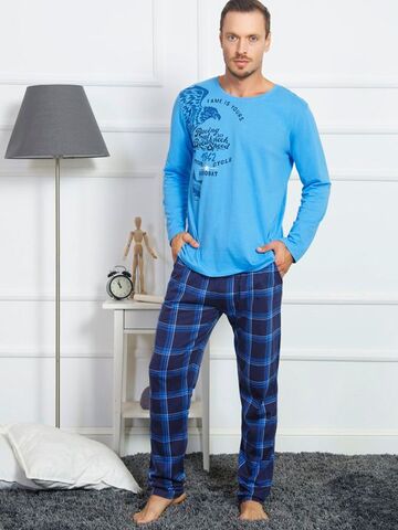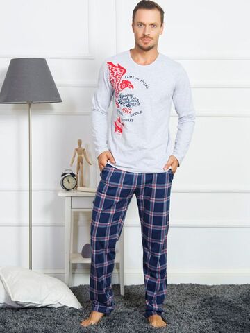 Трикотажный комплект. Футболка из однотонной ткани, с длинным рукавом с принтом, брюки прямого покроя в клетку. В комплекте: футболка, брюки.