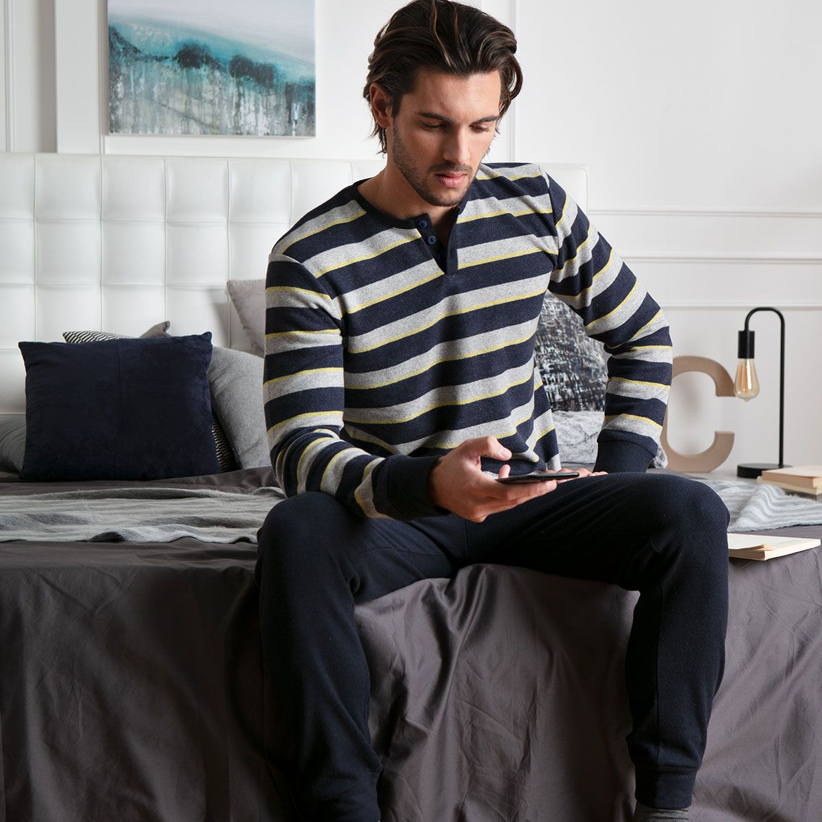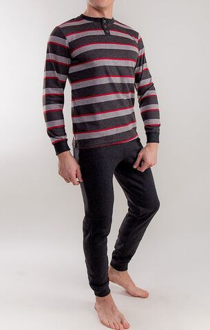 Мужской домашний костюм из плотного смесового трикотажа Пунто Милано: полосатая блуза с застежкой на пуговицах в вырезе горловины и контрастные брюки. Рукава блузы и края брюк отделаны манжетами. В комплекте: блуза, брюки.