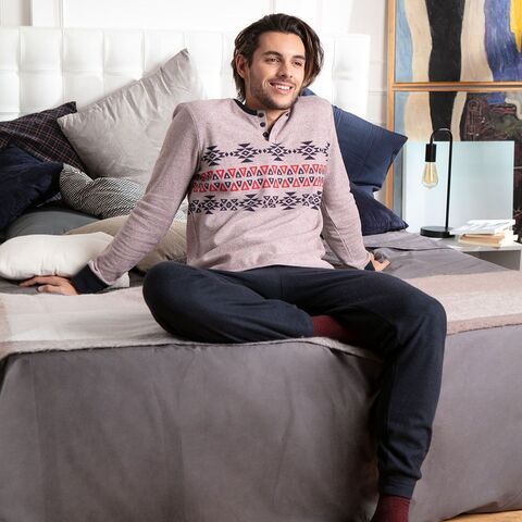 Мужской домашний костюм из плотного смесового трикотажа Пунто Милано: блуза с застежкой на пуговицах в вырезе горловины с этническим орнаментом и контрастные брюки. Рукава блузы и края брюк отделаны манжетами. В комплекте: блуза, брюки.