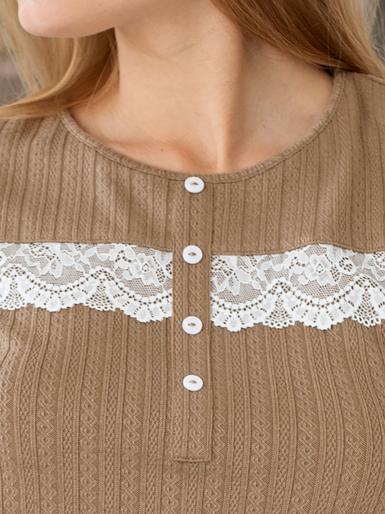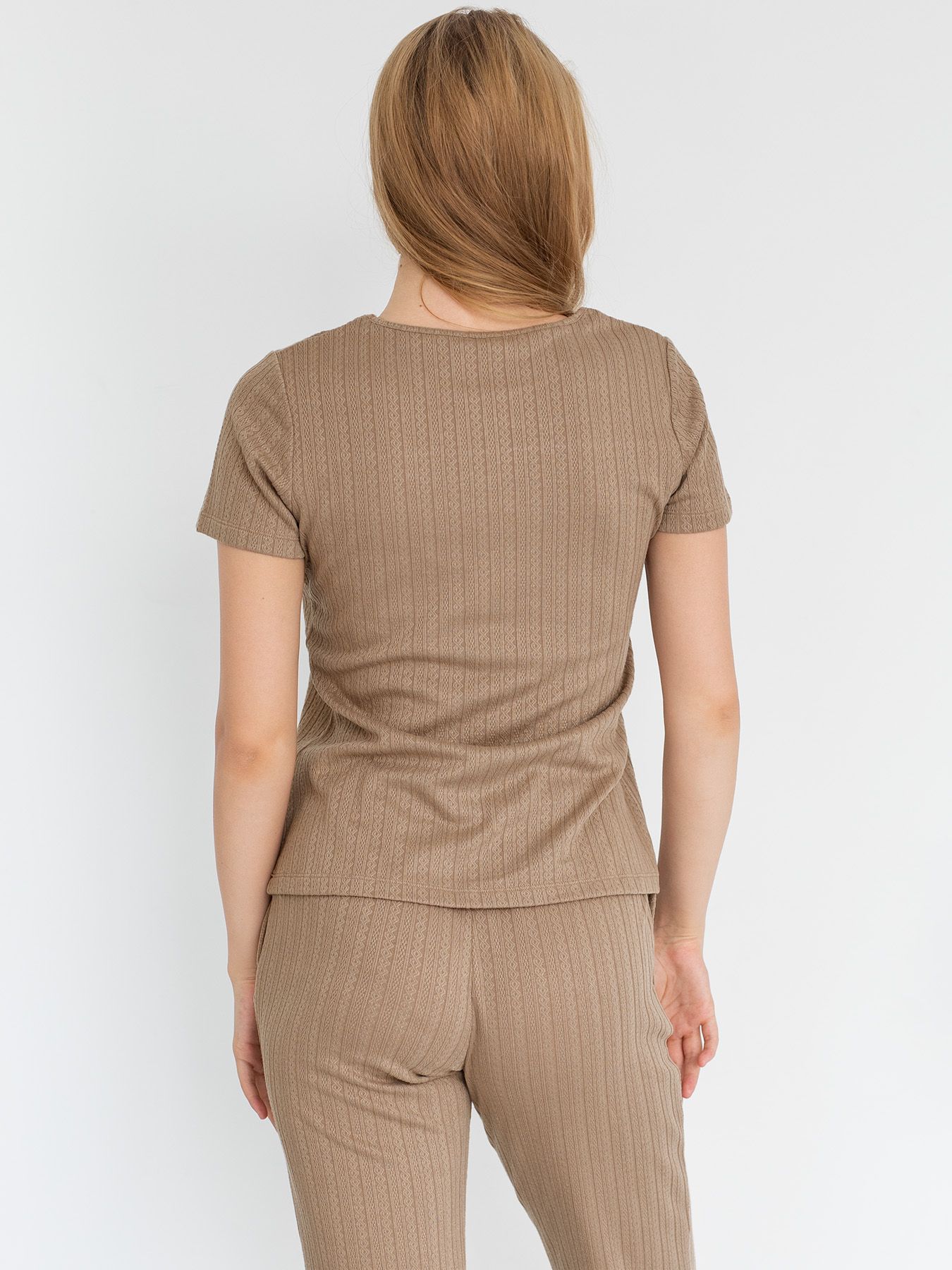 Женский домашний костюм: прямые брюки на резинке и футболка с коротким рукавом. Комплект выполнен из трикотажа, внутренняя сторона гладкая, внешняя – с фактурным узором «косички», лакомого цвета шоколадного мороженого. Футболка прямого силуэта, с круглым вырезом горловины. Грудь украшает планка с пуговками – имитация застежки. Кокетка отделана белым кружевом, прекрасно гармонирующим со «вкусным» цветом костюма. В брюках – удобные боковые карманы. В комплекте: футболка, брюки.