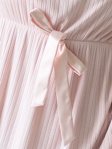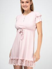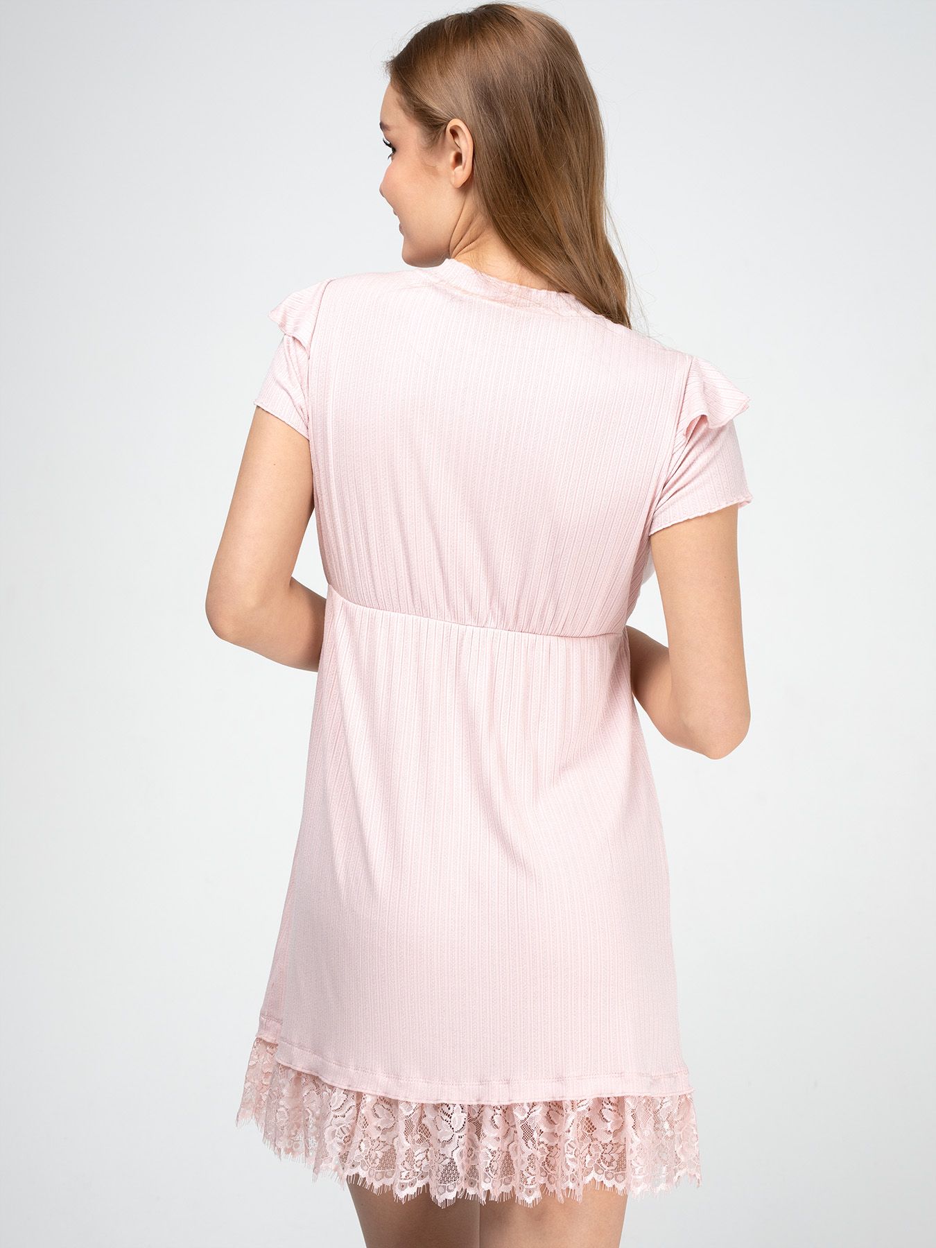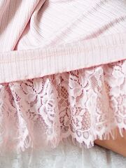 Домашняя сорочка с коротким рукавом, из мягкой, приятной к телу вискозной ткани «в рубчик» нежно-розового цвета. Завышенная талия подчеркнута резинкой и очаровательным шелковым бантиком. Романтичный силуэт подойдет любой леди, а кружево и оборочки усилят мечтательное настроение.