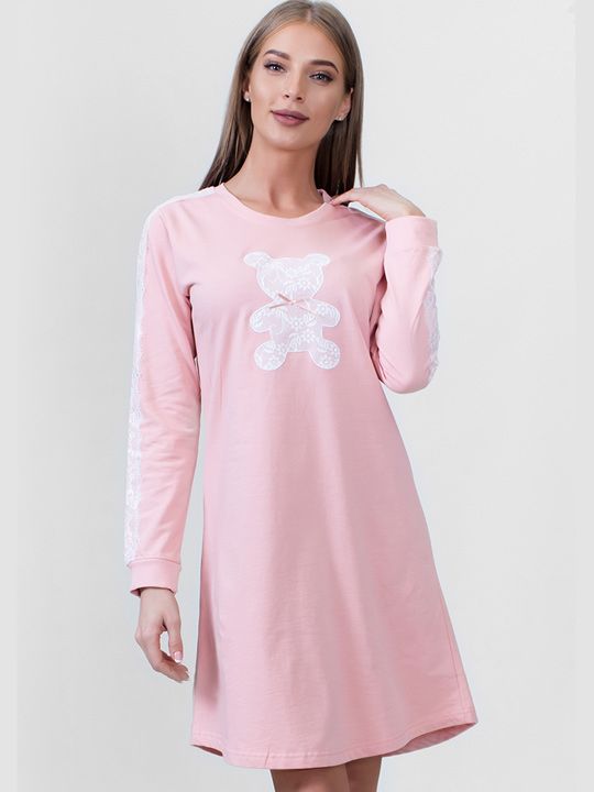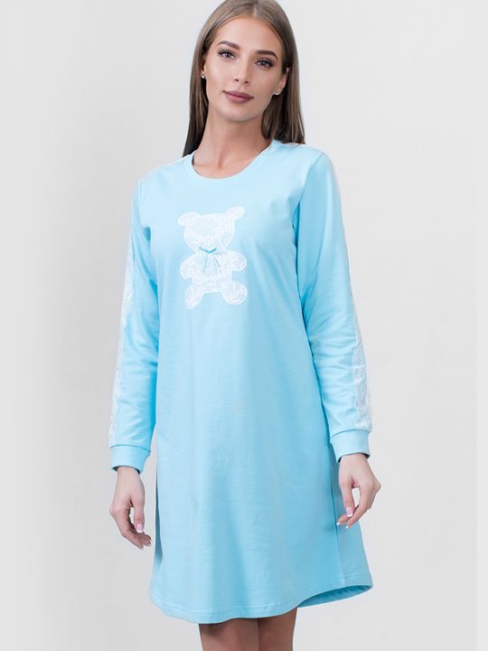 Трикотажная байковая туника из однотонной ткани с длинным рукавом. Впереди аппликация из кружева, на рукавах кружевные лампасы.