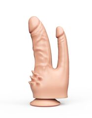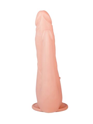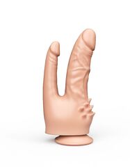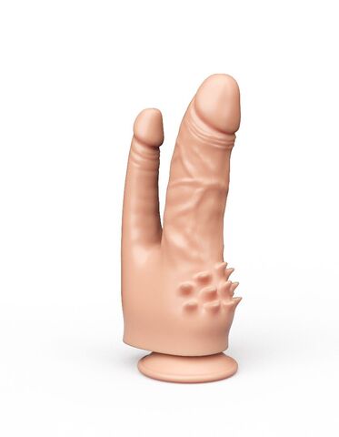 Стимулятор представляет собой слившиеся воедино фаллосы разного размера. Большой, с рисунком напряжённых вен, предназначен для вагинальных ласк. Тоненький идеально подходит для чувственных анальных проникновений.