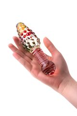 Этот яркий стеклянный фаллос можно вводить в вагину с любой стороны: и гладким конусом, усыпанным объемными точками по всей длине, и шариком на продолговатом основании.