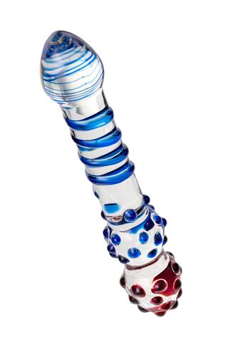 Популярная модель стеклянных игрушек - двойной фаллос с ограничительным основанием по середине. Одна половинка - небольшой прозрачный фаллос с круглой головкой и объемными цветными массажными точками, вторая часть - с гладкой головкой и объемной спиралью. Весь фаллос окрашен вручную, гипоаллергенен и безопасен. Минимальный диаметр - 2,7 см.