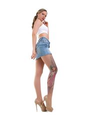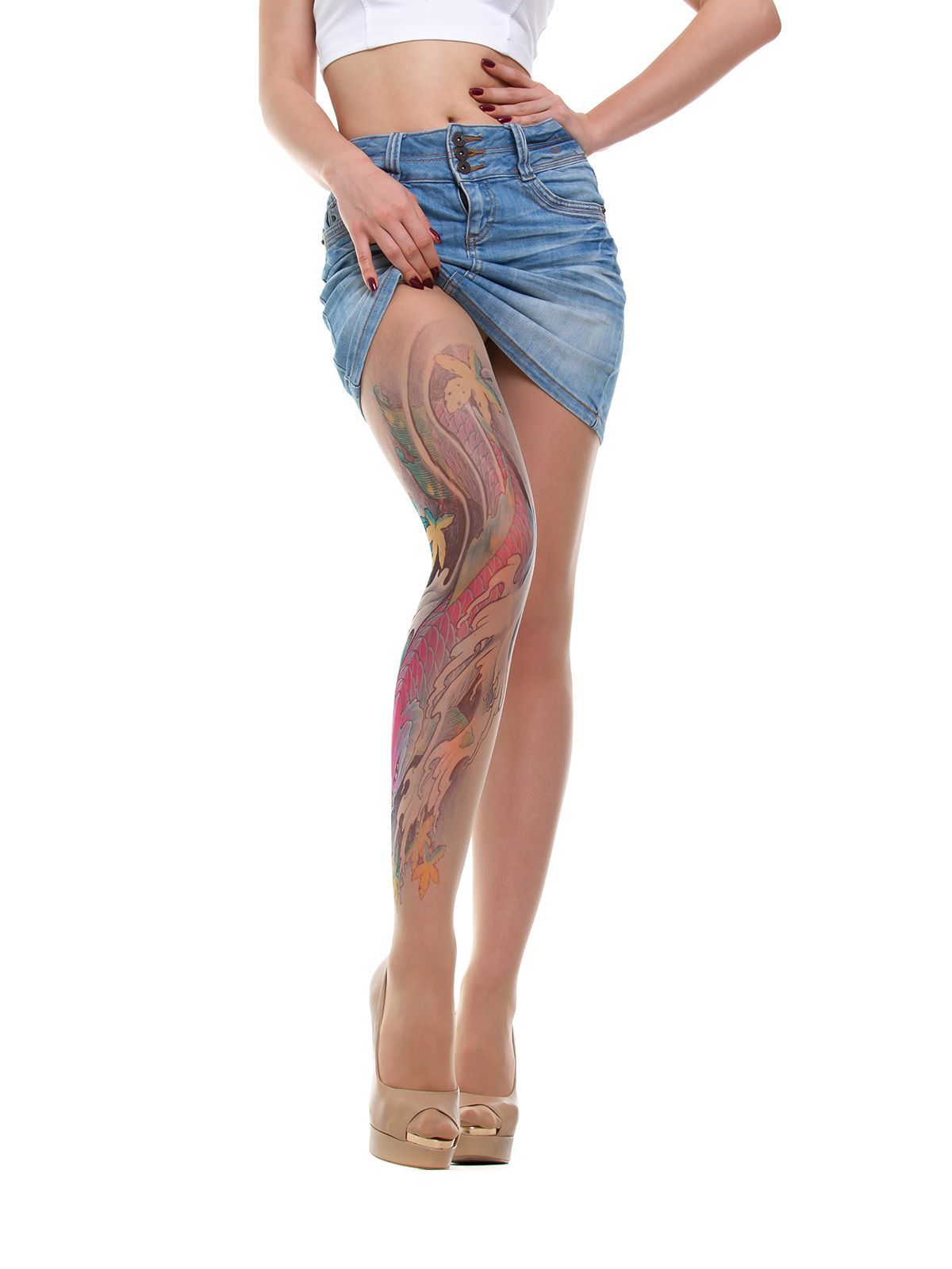 Эффектные колготки с рисунком-тату на правой ножке. Принт не стирается, не выгорает со временем. Можно стирать в стиральной машине. Крепкие, подойдут на рост от 145 до 180 см. Плотность - 40 ден.