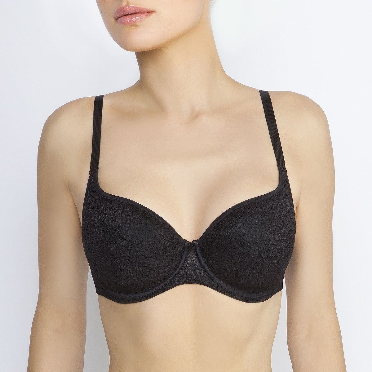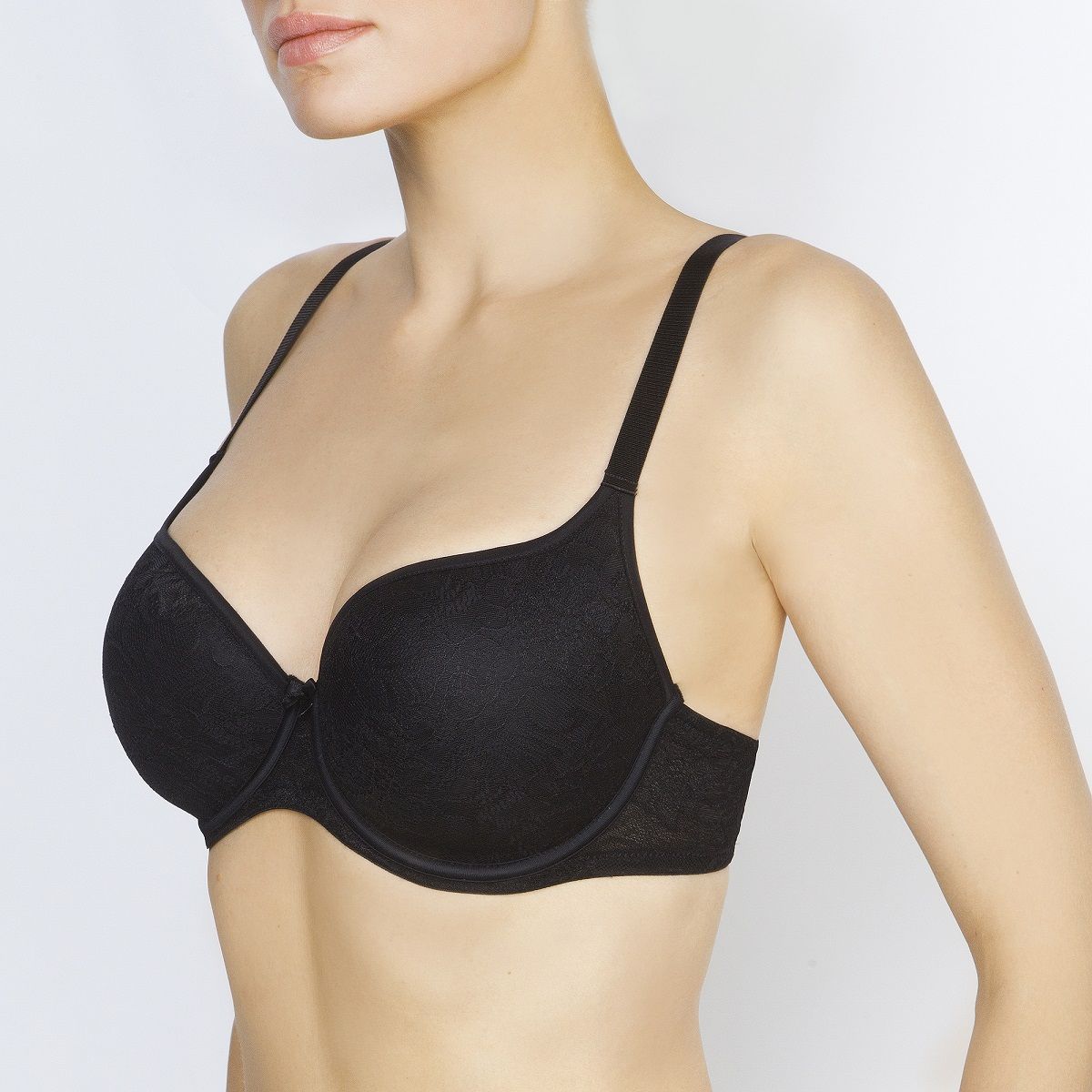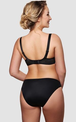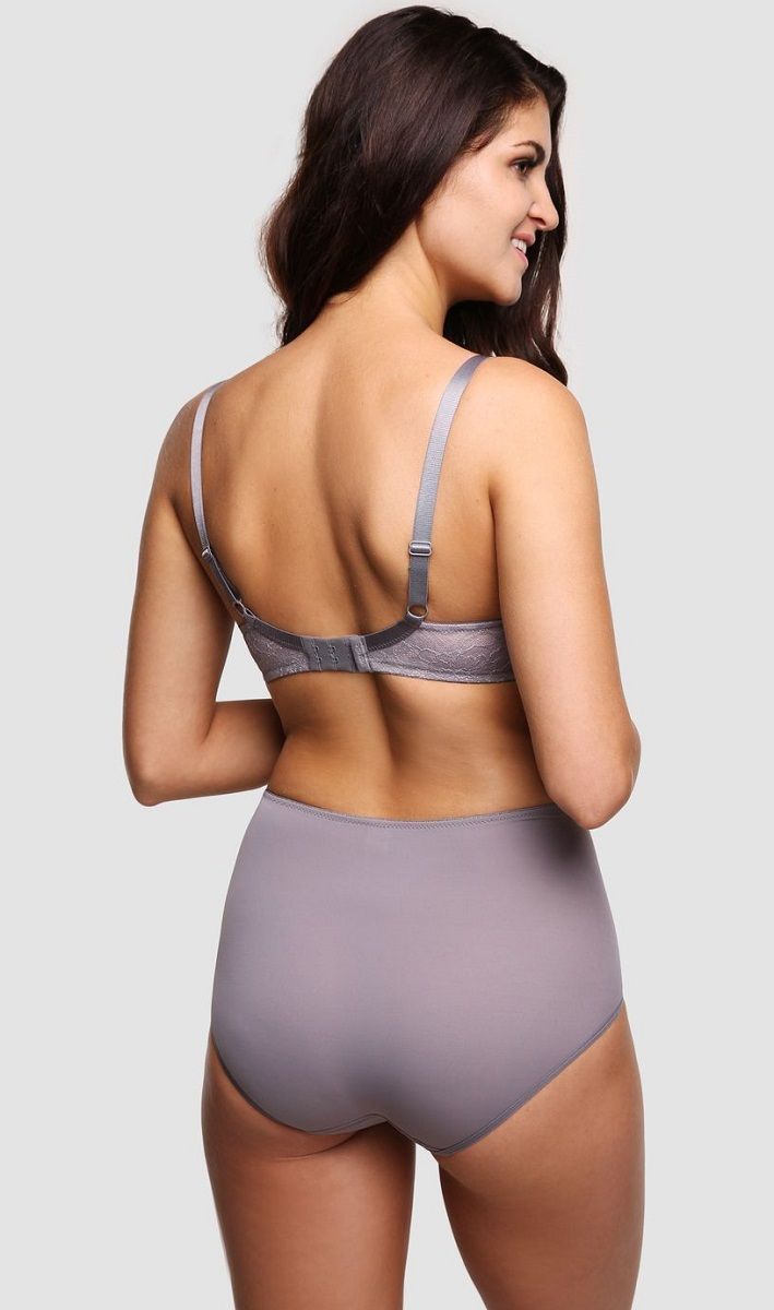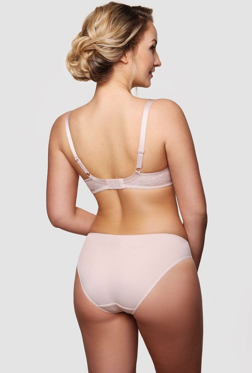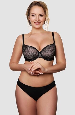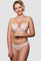 Бюстгальтер-спейсер на каркасах. Внутренняя часть чашки в области пришива бретели усиливается не эластичной тканью в сгиб, без дополнительных швов для комфортности. Именно этот элемент позволяет не растягиваться ткани в подмышечной зоне и сохраняет форму чашки. Боковые панели дополнительно дублированы эластичной сеткой. Гладкие, классические бретели регулируются на спинке.