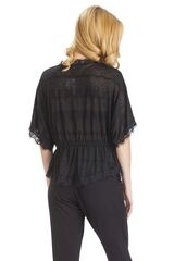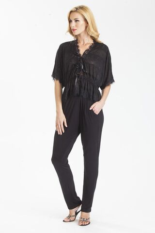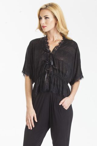 Элегантный комплект выполнен из легкой, натуральной ткани со структурным узором. Топ свободного силуэта декорирован в верхней части завязками. Рукав кимоно отстрочен кружевами. Брючки зауженного фасона с карманами, на комфортной резинке по талии. В комплекте: топ, брючки.