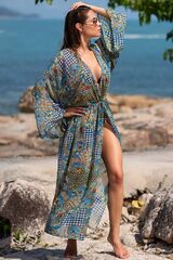 Длинная пляжная туника с рукавами 3/4 выполнен из принтованного воздушного шифона. В поясе кулиска с завязками и кисточками на концах. В боковых швах эффектные разрезы.