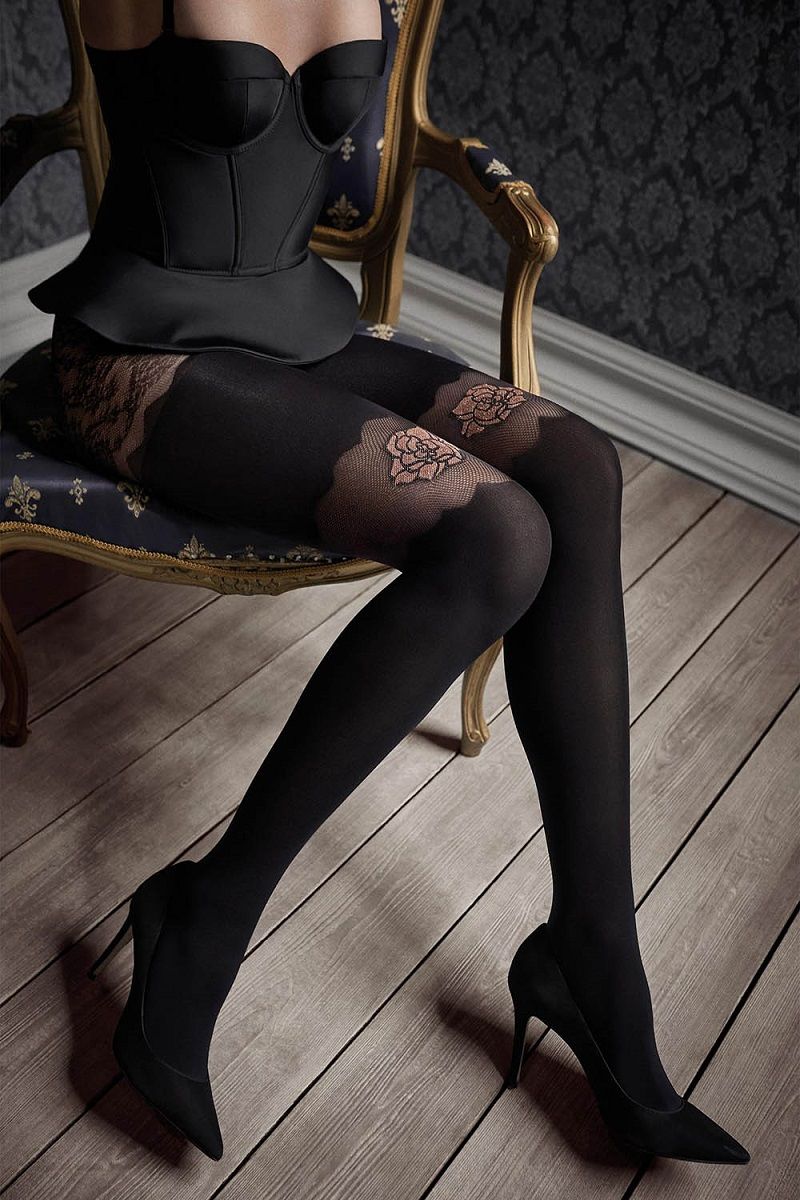 Элегантные колготки Gucci выполнены из микрофибры. Колготки декорированы блестящим цветочным узором. Кружевной пояс с силиконовой полосой, предотвращающей скольжение колготок. Плотность - 60 ден.