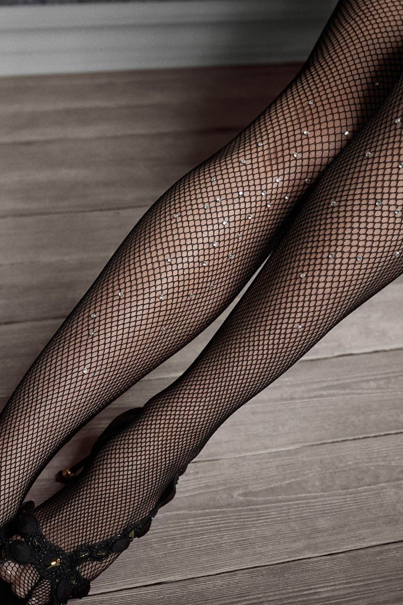 Элегантные колготки в сеточку Gucci G47 декорированы россыпью кристаллов. Ажурный пояс с силиконовой полосой, предотвращающей скольжение колготок.