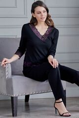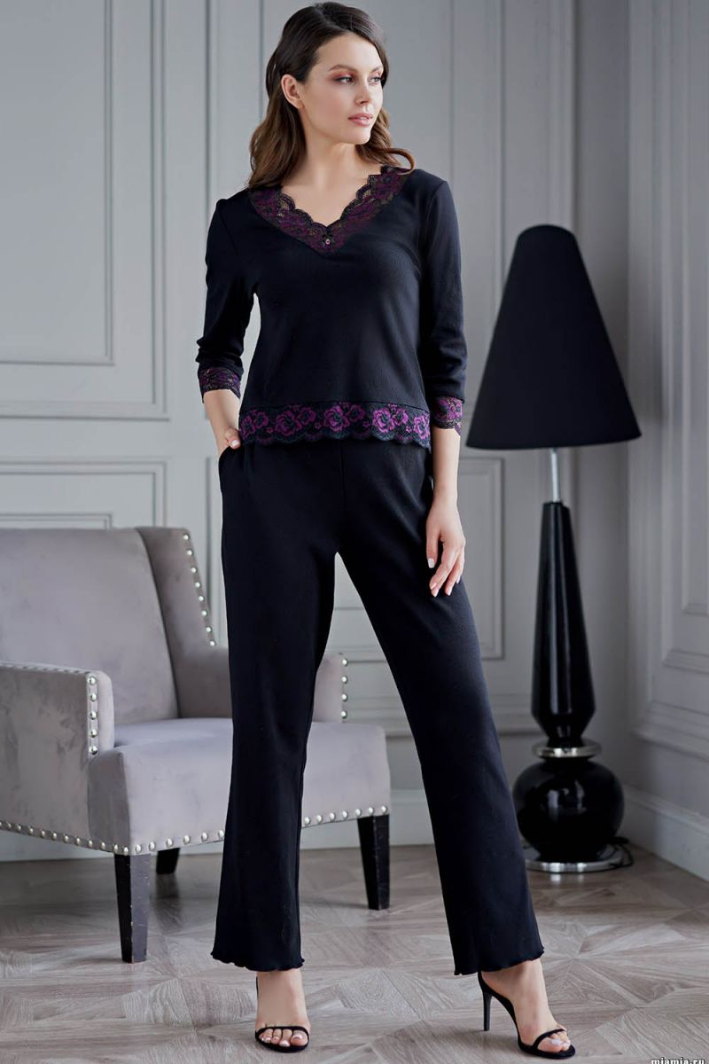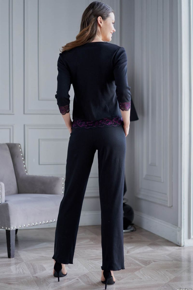 Элегантный брючный комплект выполнен из фактурного трикотажного полотна в рубчик. Футболка с рукавами 3/4 украшена двухцветным эластичным кружевом по низу, вдоль V-образной горловины и по низу рукавов. На горловине футболки изысканный бантик с подвеской. Длинные брюки с широкой резинкой по талии и боковыми карманами. В комплекте: футболка, брюки.