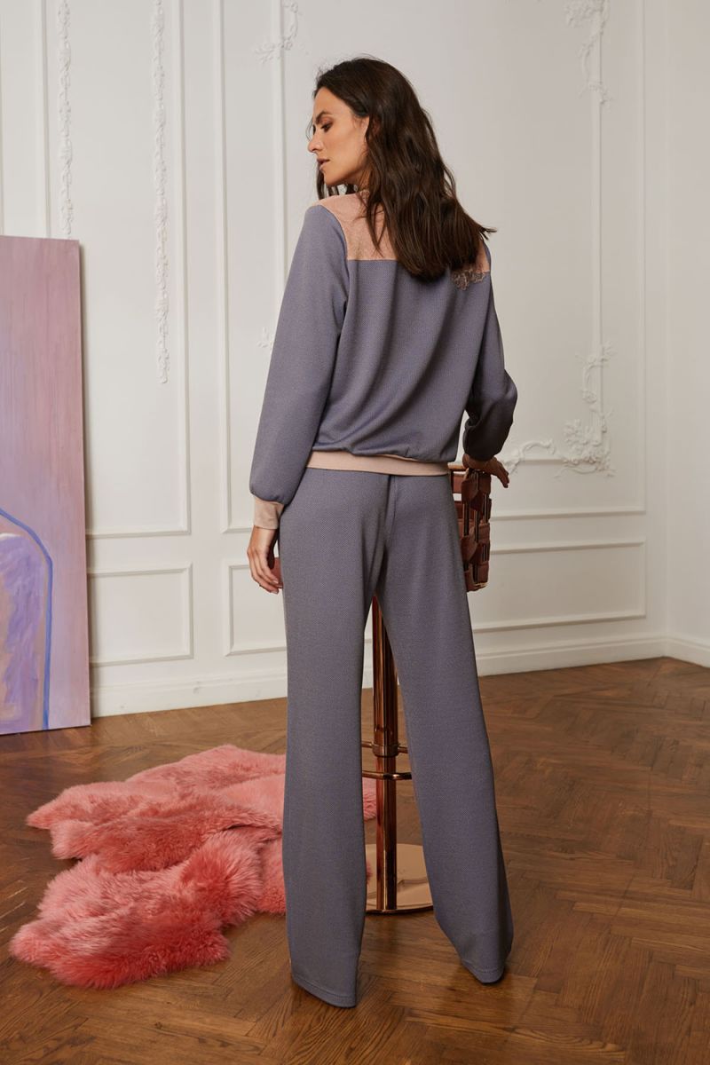 Элегантный домашний джемпер. Модель свободного силуэта с длинными рукавами. На груди и спинке кружевная аппликация. Комфортная и при этом женственная модель для дома и отдыха.