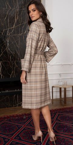 Элегантный халат в клетку средней длины. Модель на запахе, с отложным воротником. Глубокие накладные карманы добавляют модели функциональности. Длинный, съемный пояс подчеркивает силуэт. Комфортная модель для женщин, ценящих классический стиль.