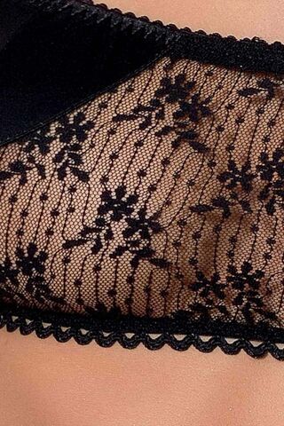 Элегантный комплект из кружевного и стрейч-атласного материала. Бюстгальтер в форме топа, на застежках, широкий пояс для чулок на атласной шнуровке, пажи регулируются по длине, не отстегиваются, трусики стринги. В комплекте: бюстгальтер, пояс, трусики-стринги.