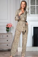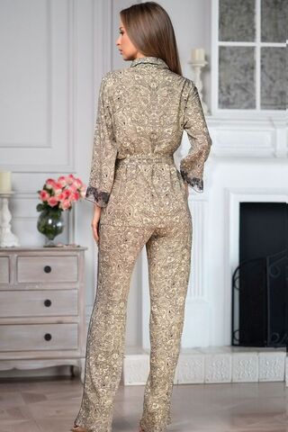 Элегантный костюм из тканной принтованной вискозы состоит из жакета и брюк. Жакет с длинными рукавами, с фиксацией на пуговицу и поясом с кисточками. Края бортов и воротника украшены тонкими черными кантами. Низ рукавов изящно декорирован роскошной вышивкой на тюле. Брюки длинные, в боковых швах карманы и декоративные изящные канты. В комплекте: жакет, брюки.