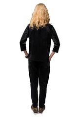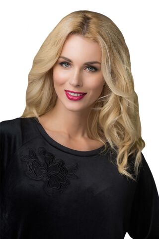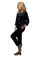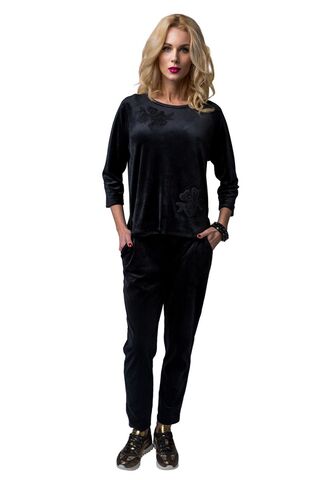 Элегантный женский костюм свободного кроя из мягкого бархатного материала. Свитшот с рукавами реглан декорирован асимметричной аппликацией из кружевных цветов. Брюки – средней посадки, заужены к низу, с боковыми карманами. Костюм подходит для дома и активного отдыха. В комплекте: свитшот и брючки.