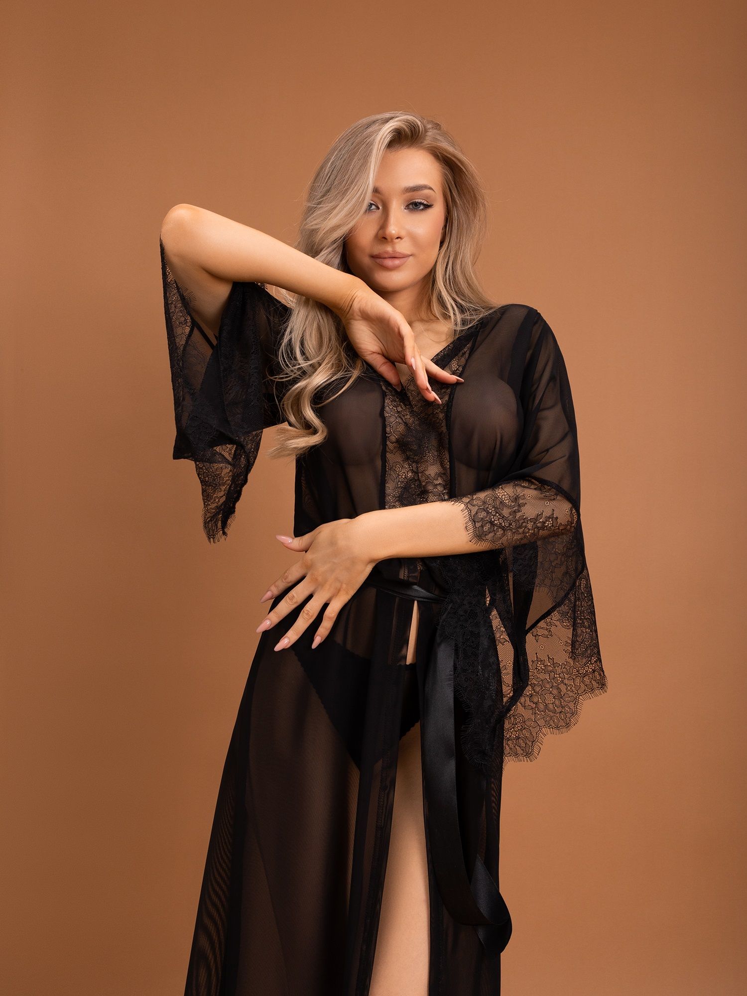 Этот длинный пеньюар создан для тех, кто желает выглядеть элегантно и изысканно. Этот наряд сделан из прозрачной сетки, что позволяет обнажить красивое женское тело, но в то же время не показывая его полностью. При этом, потрясающее тонкое французское кружево с ресничками, отделка края и низа, придают пеньюару особый шарм и изысканность. К тому же, благодаря расклешенным рукавам, этот пеньюар создает эффект легкости и плавности, а также подчеркивает тонкость и элегантность женских рук. В нем вы будете чувствовать себя уверенно и привлекательно, не снимая наряд даже во время близости. Это идеальный выбор для шикарной женщины, которая ценит утонченность и чувственность, и хочет показать это в своем наряде. В комплекте: пеньюар. Белье не входит в комплект!