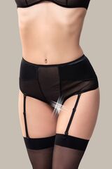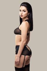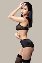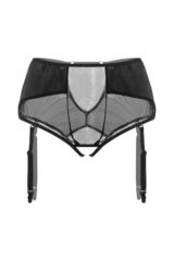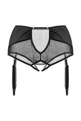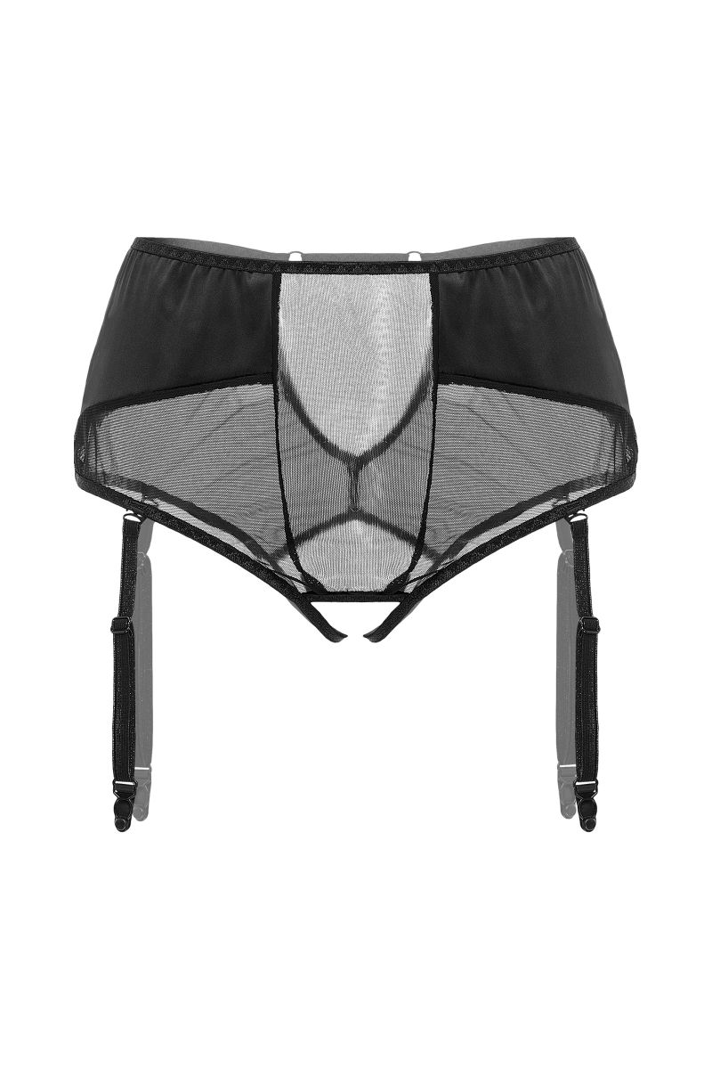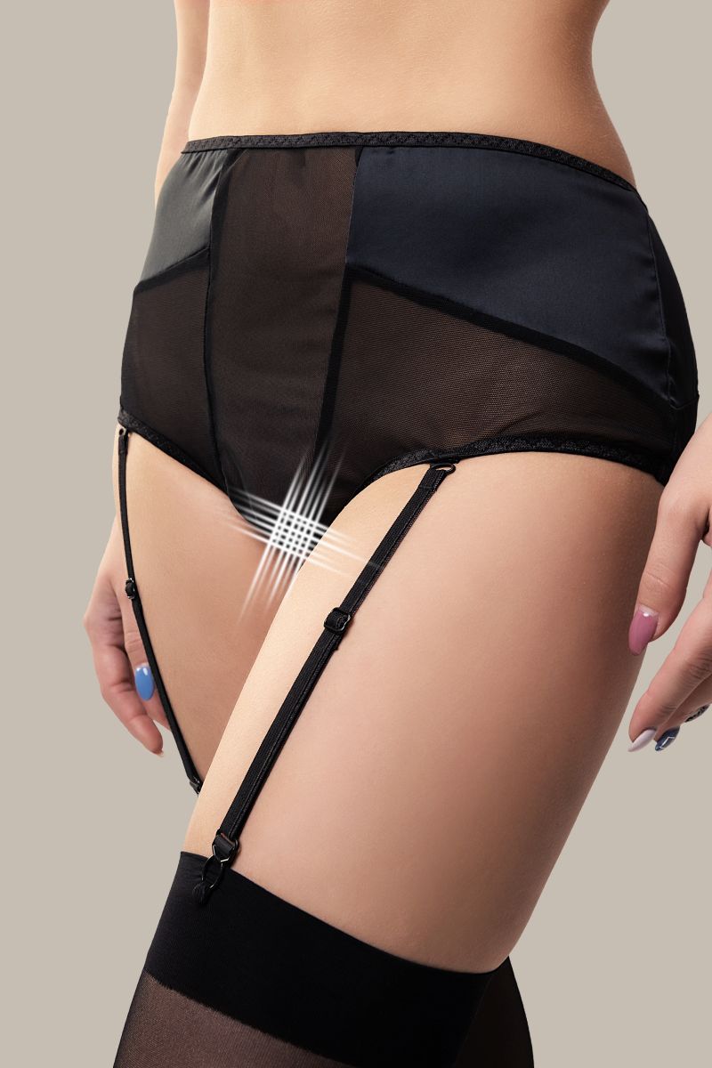 Эротические трусики-пояс для чулок «Э?лэгэнс» (англ. Elegance – «Элегантность») из тонкой прозрачной эластичной сетки и стрейч-сатина облегают бедра, ощущаются невесомыми, не сковывают движений, но визуально меняют силуэт. Шелковистая поверхность материала дарит приятные ощущения при прикосновении. Современные элементы дизайна тешат женское самолюбие. Трусики с высокой талией зрительно удлиняют ноги, подчеркивают сексуальный переход от талии к бедрам. Непрозрачные вставки скрадывают объем в области бедер. Швы, вытачки и регулировка по талии создают силуэтную посадку. Съемные регулируемые пажи, открытая зона копчика и эротический доступ подчеркивают чувственный образ. Чулки не входят в комплект!