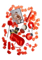 Эротический подарочный набор состоит из: вибратора из с бархатистым покрытием и стразами, виброяичка с выносным пультом управления, наручников с мехом и набором ключей, эрекционного кольца с вибрацией, легко растягивается, массажной свечи,маски на глаза, палочки-пера с меховым наконечником, двух смазок по 4 мл (водная основа). Все красиво украшено лепестками роз. Длина вибратора - 15 см., диаметр - 2,5 см.