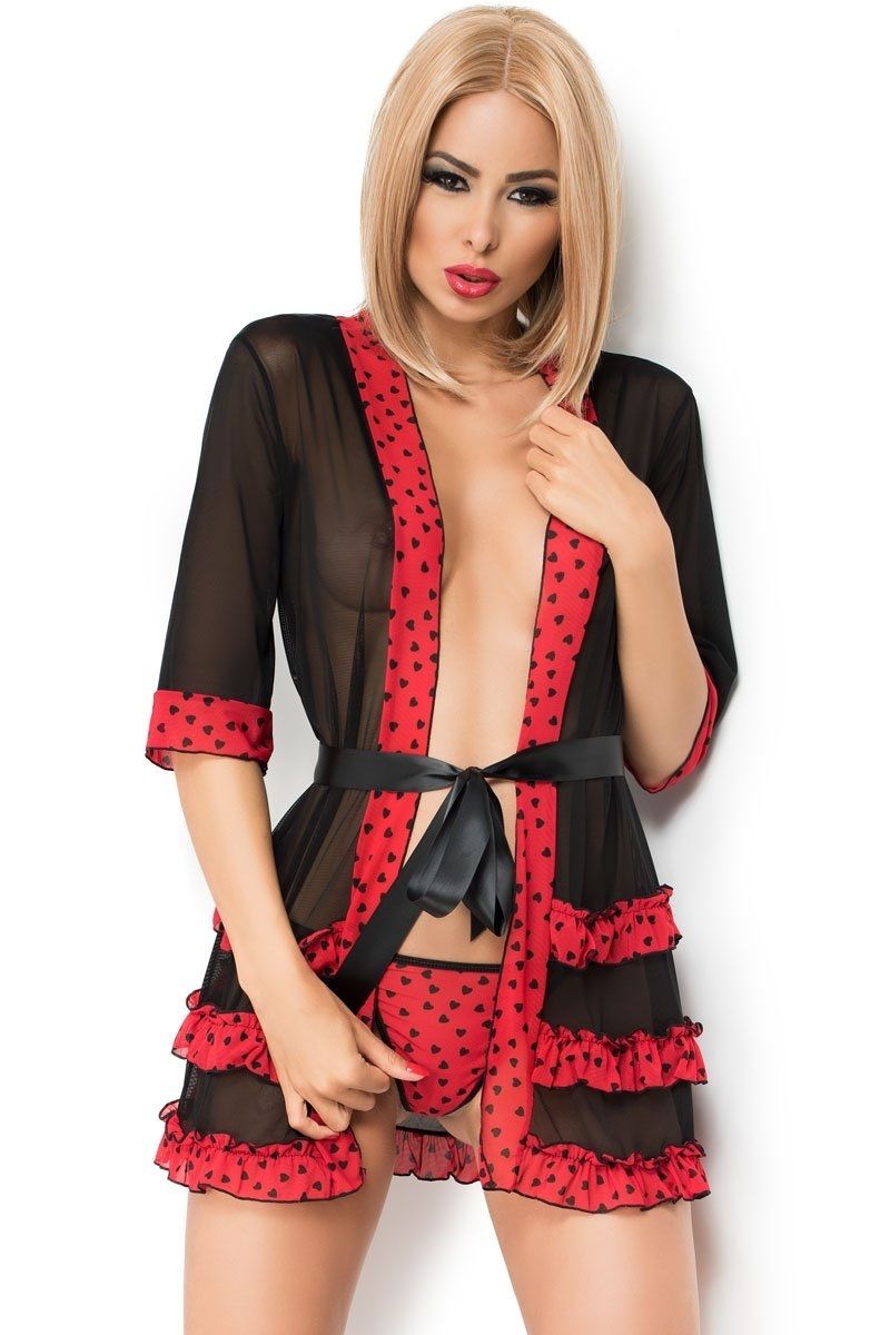 Удобный, но при этом красивый и сексуальный халатик-пеньюар в комплекте с яркими трусиками. Прозрачная ткань, кокетливые оборочки и яркий принт - то, что надо, чтобы встретить за чашечкой кофе очередное прекрасное утро с любимым мужчиной. В комплекте: пеньюар, трусики-стринги.