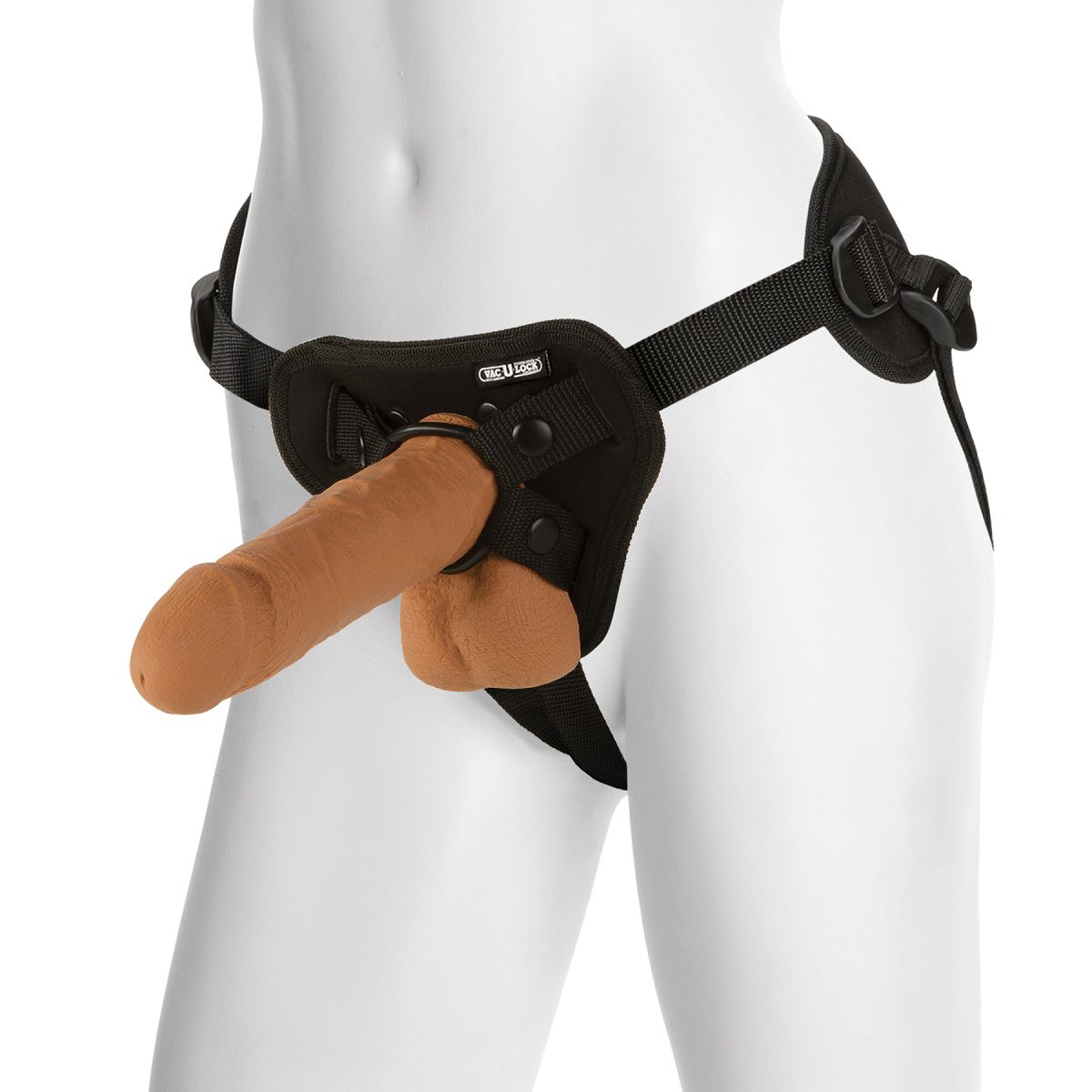 Фаллос с мошонкой на регулируемых трусиках. В страпоне реализовано два типа крепления фаллоимитирующих насадок: крепление с помощью пластмассового штырька Vac-U-Lock, а также крепление с помощью ограничительного металлического кольца. Крепление с помощью пластмассового штырька Vac-U-Lock позволяет использовать любую фаллоимитирующую насадку типа Vac-U-Lock; крепление с помощью ограничительного металлического кольца позволяет использовать любой фаллоимитатор, оснащенный присоской, либо фаллоимитатор с круглой площадкой в основании.