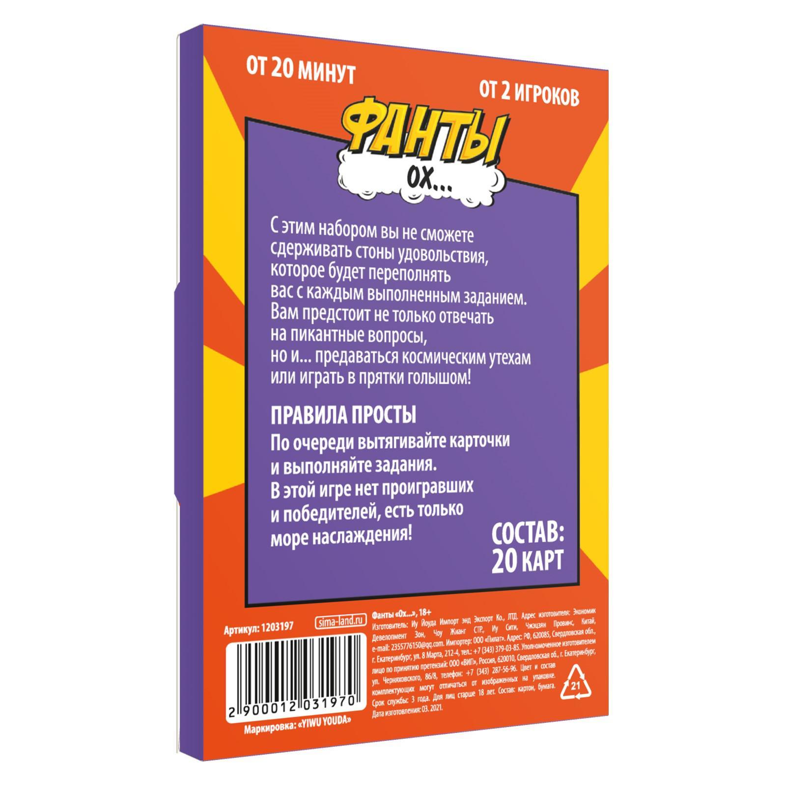 Всё, что требуется, это открыть набор фантов и по очереди выполнять задания с карточек. В игре нет победителей, ведь о каком выигрыше может идти речь, когда вас и партнёра закружило в вихре удовольствия? Окунитесь в омут страсти вместе с этими волнующими фантами. В комплекте: 20 карточек с фантами.