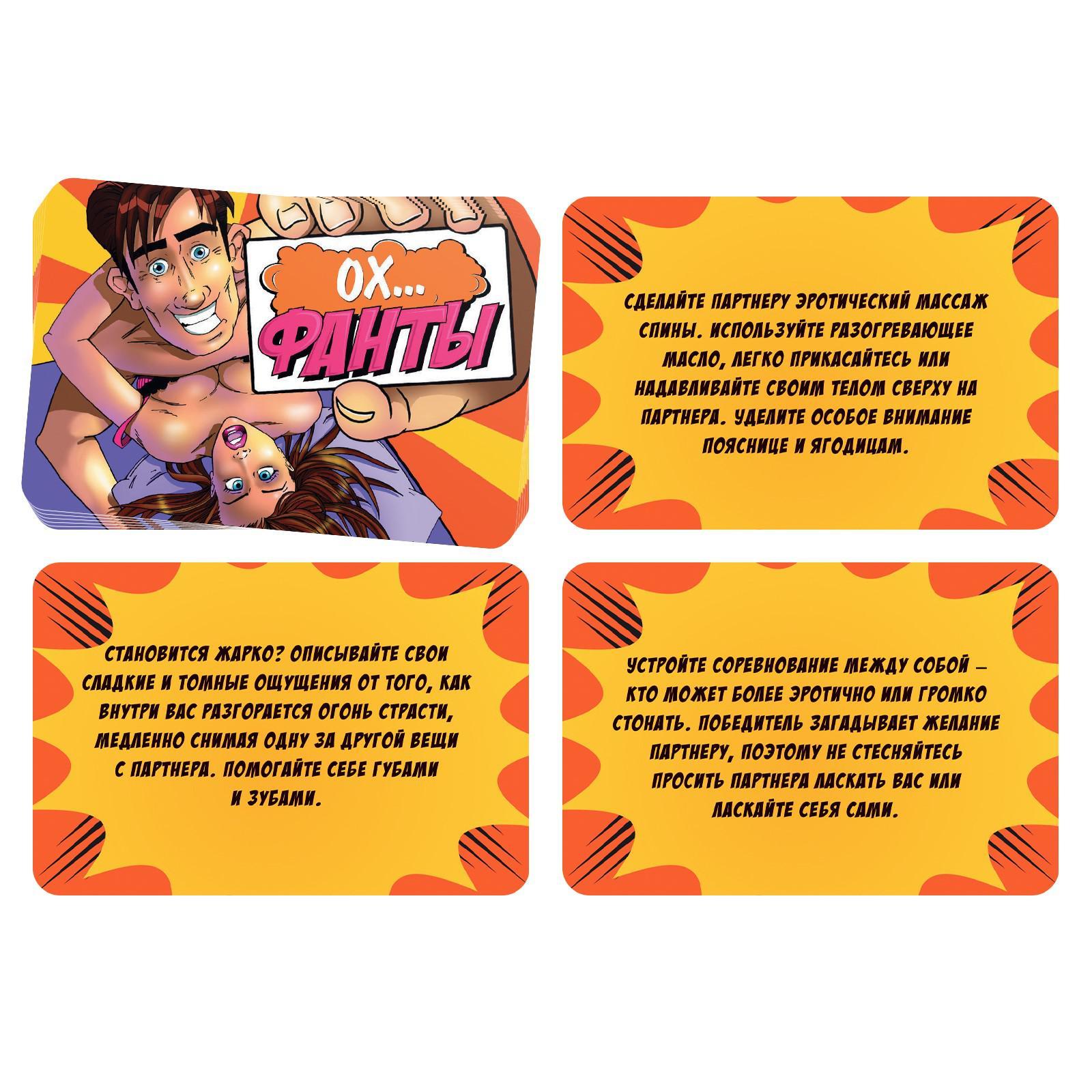 Ах… ох… чувствуете? Это стоны наслаждения, которые больше нельзя сдерживать. Перед вами набор фантов с заданиями для двоих. Порадуйте партнёра, предавшись удивительным занятиям в постели. Но не забудьте добавить в сегодняшний вечер долю юмора, а в этом помогут «Ох…» фанты.