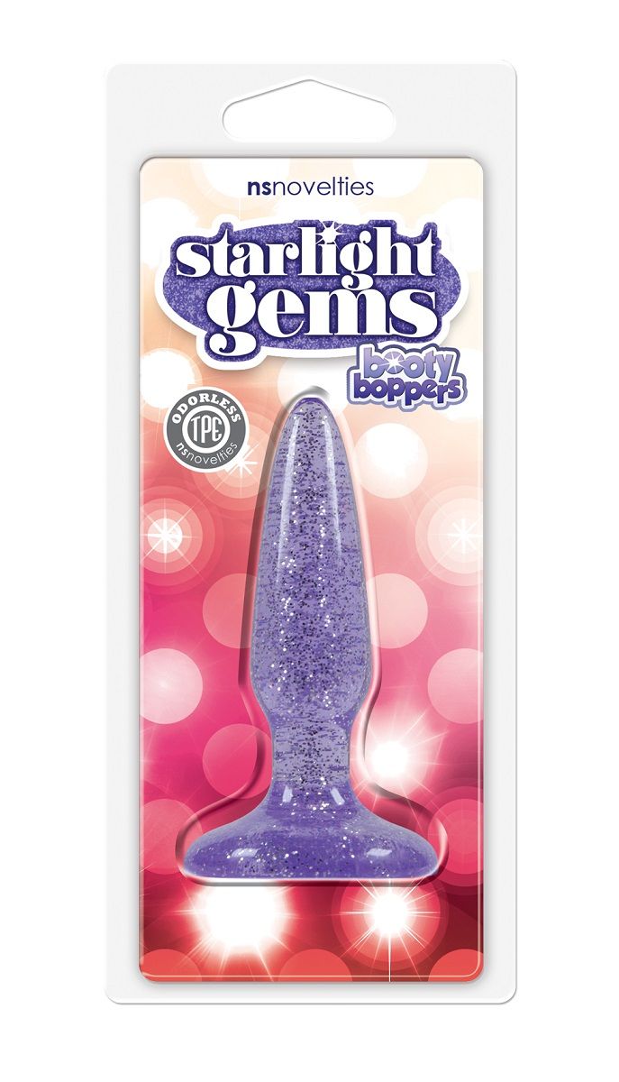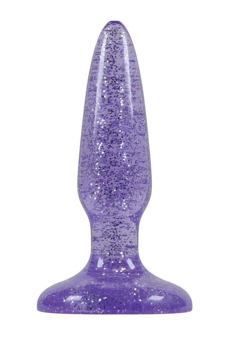 Фиолетовая анальная пробка с блёстками Booty Boppers Mini. Широкое ограничительное основание. Отличный размер для начинающих.