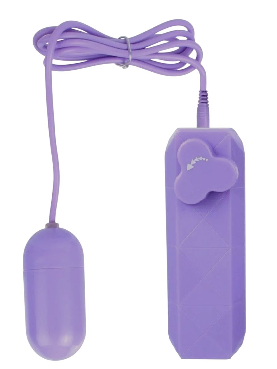 Фиолетовое виброяйцо с пультом управления на проводе. Подходит для клиторальной стимуляции, массажа эрогенных зон, вагинального введения. Мультискоростная вибрация, управляемая поворотом колесика.
