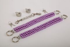 Красивые наножники из фиолетового жемчуга с замочками в виде сердца и четырьмя ключиками. Чтобы ограничивать движения есть небольшая цепочка с двумя карабинами. Упаковка - картонная золотая коробка с бантиком. Длина соединительной цепочки - 13 см.