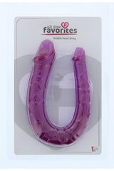 Полупрозрачный двойной фаллоимитатор. Рельефный, невероятно приятный на ощупь. Этот двуглавый фаллоимитатор имеет жесткую U-образную форму для двойного проникновения. Один конец толще другого. Обе головы имеют форму головки. Минимальный диаметр - 2 см.