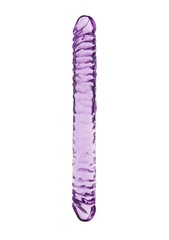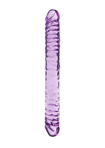 Полупрозрачный двухголовый фаллоимитатор фиолетового цвета. Гибкий, рельефный, без швов.