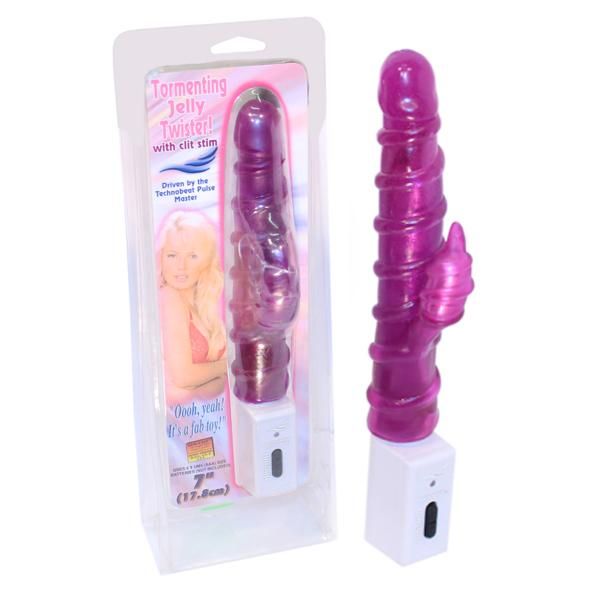 Фиолетовый вибратор со спиралевидным рельефом и клиторальным отростком.