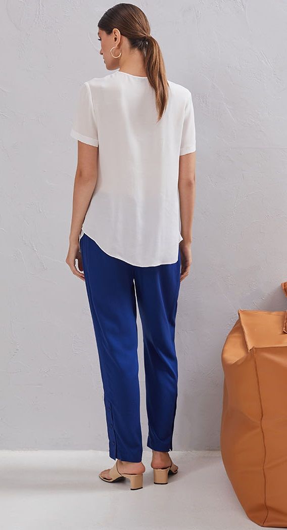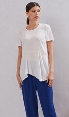 Универсальная модель футболки нейтрального цвета. Изделие из вискозы высокого качества. Свободный фасон, асимметричный крой, средние цельнокроеные рукава с мягкой линией плеча. Футболка отлично подходит для домашнего и повседневного гардероба.