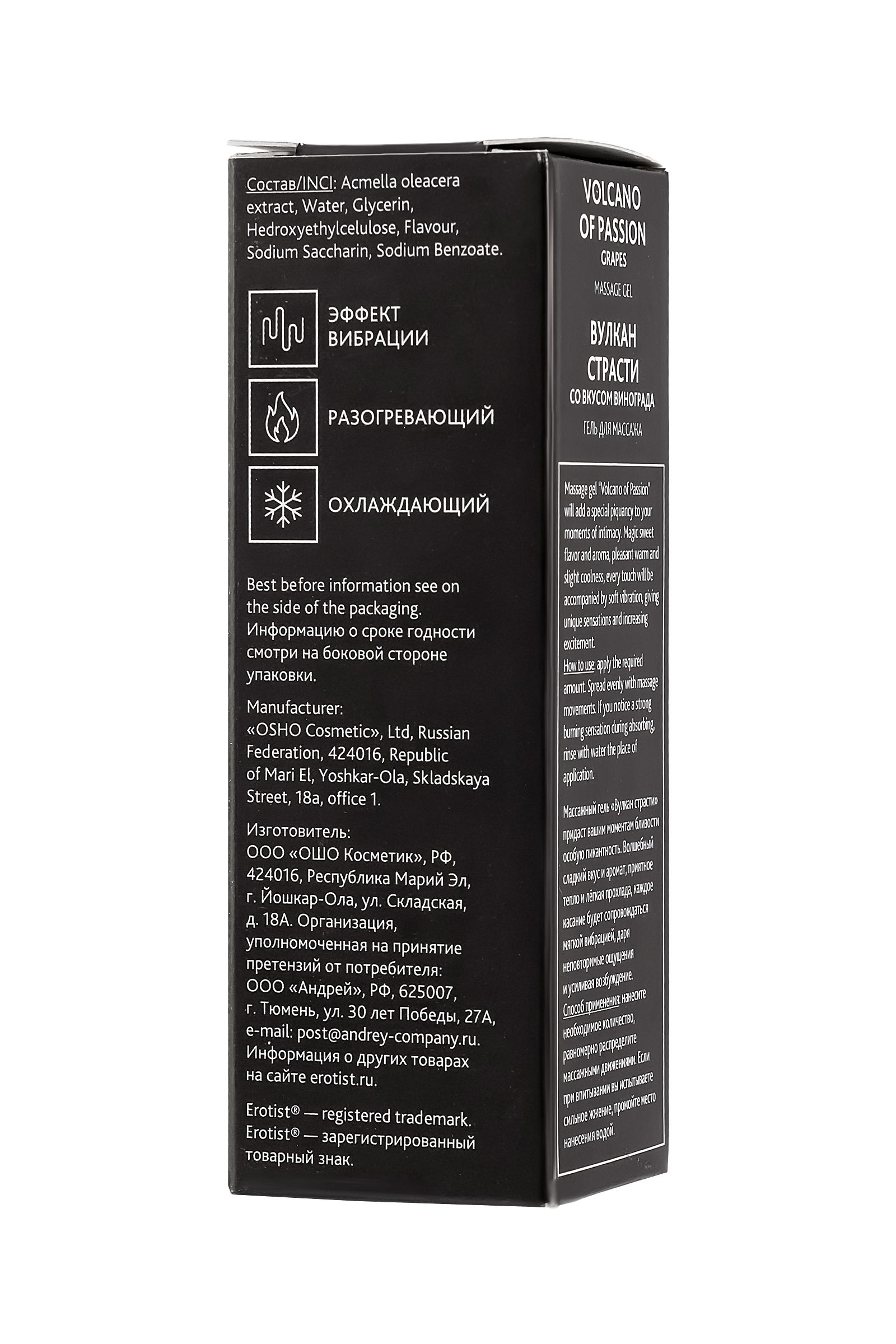 Массажный гель «Вулкан страсти» придаст вашим моментам близости особую пикантность. Волшебный сладкий вкус и аромат, приятное тепло и лёгкая прохлада, каждое касание будет сопровождаться мягкой вибрацией, даря неповторимые ощущения и усиливая возбуждение. Нанесите немного жидкого геля на интимные зоны, и через несколько секунд вы почувствуете тепло, затем в течение 2-3 минут легкую вибрацию и легкий холодок. Длительность эффекта зависит от особенностей вашего организма. Гель с вибрирующим эффектом для интимных зон на основе натуральных ингредиентов, без парабенов. Вкус и аромат винограда. Подходит для поцелуев и орального секса.