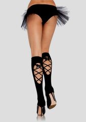 Акриловые гетры с декором в виде корсетной шнуровки в области задней стороны икры и бантиков.