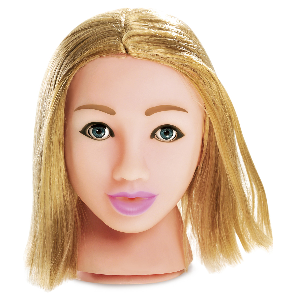 В основании шеи имеет мощную присоску, которая держится практически на любой плоской поверхности. Подвижная шея будет покачиваться в такт движениям или легко отогнется назад. Ей можно сделать любую прическу, завить или выпрямить волосы, так же можно накрасить губы вашей любимой помадой. Голубые глаза открываются и закрываются в зависимости от наклона головы. Длина - 26,7 см.
