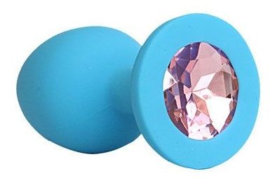 Голубая силиконовая анальная пробка с нежно-розовым кристаллом - 9,5 см.