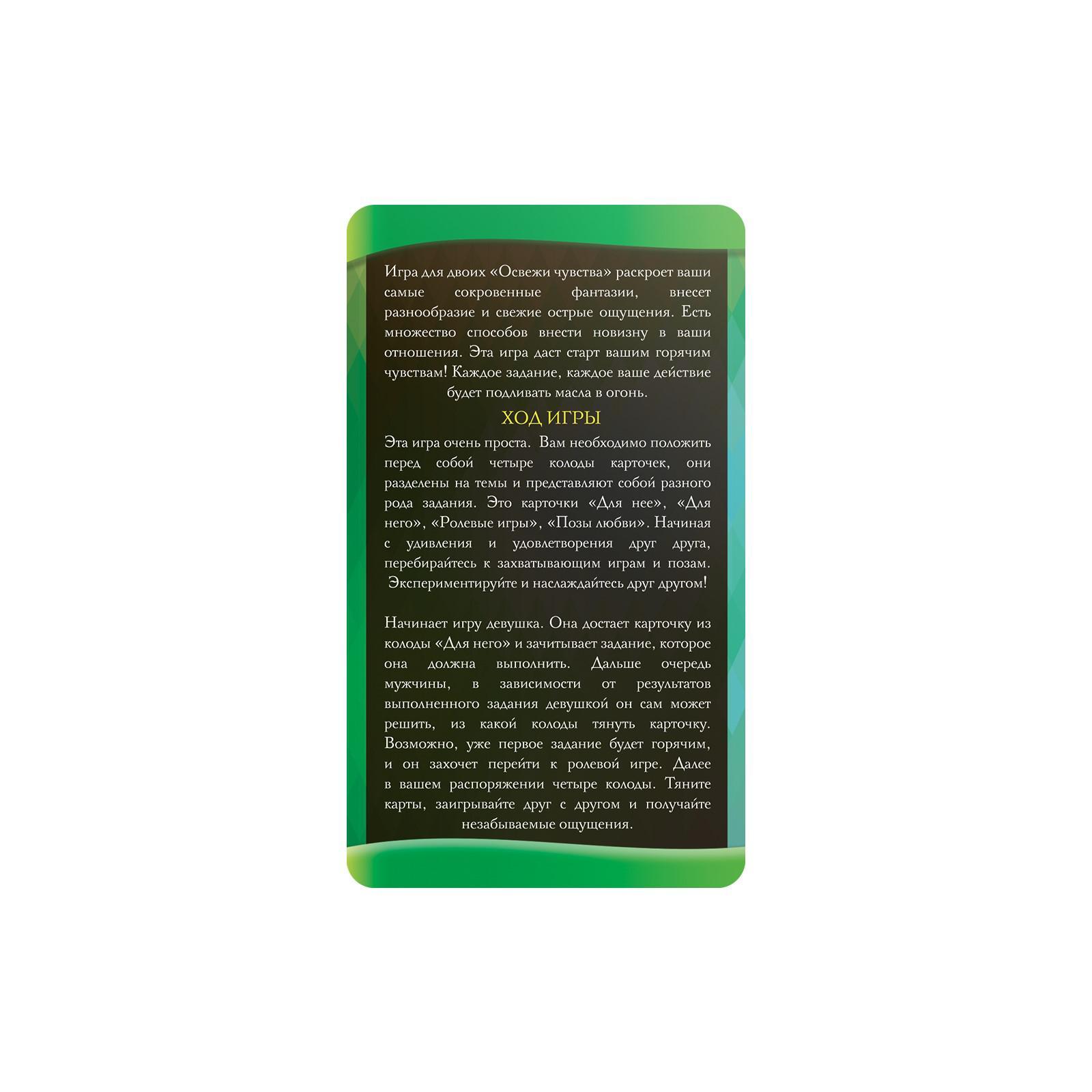 Положите перед собой четыре колоды карт, по очереди вытягивайте их и выполняйте задания. Освежите ваши чувства! В комплекте: 10 карт «Позы любви»; 10 карт «Ролевые игры»; 10 карт «Для него»; 10 карт «Для неё»; правила игры.