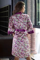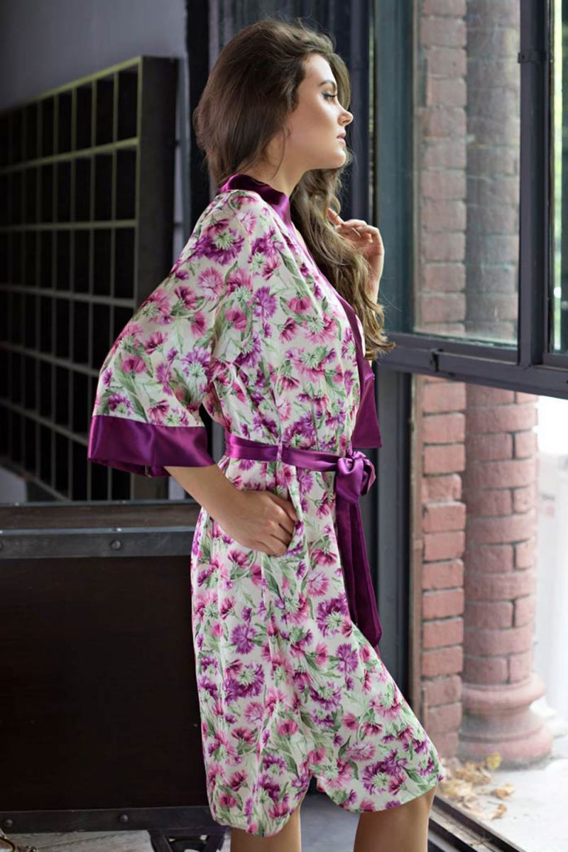 Халат средней длины прямого силуэта из атласного крепа в рубчик с цветочным принтом. Модель с втачными рукавами. Горловина и борт на обтачке, манжет рукавов и пояс выполнены из однотонного атласа. Халат с карманами в боковом шве.