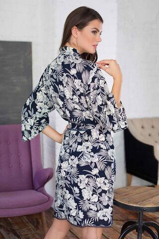 Халат средней длины прямого силуэта с V-образным вырезом горловины на полочке и рукавами длинной 7/8, выполнен из вискозы с фантазийным принтом. Халат завязывается на пояс, отделанный однотонным кантом из мелкого кружева контрастного цвета. Кисти на поясе великолепно сочетаются с принтом на ткани.