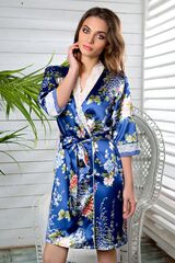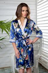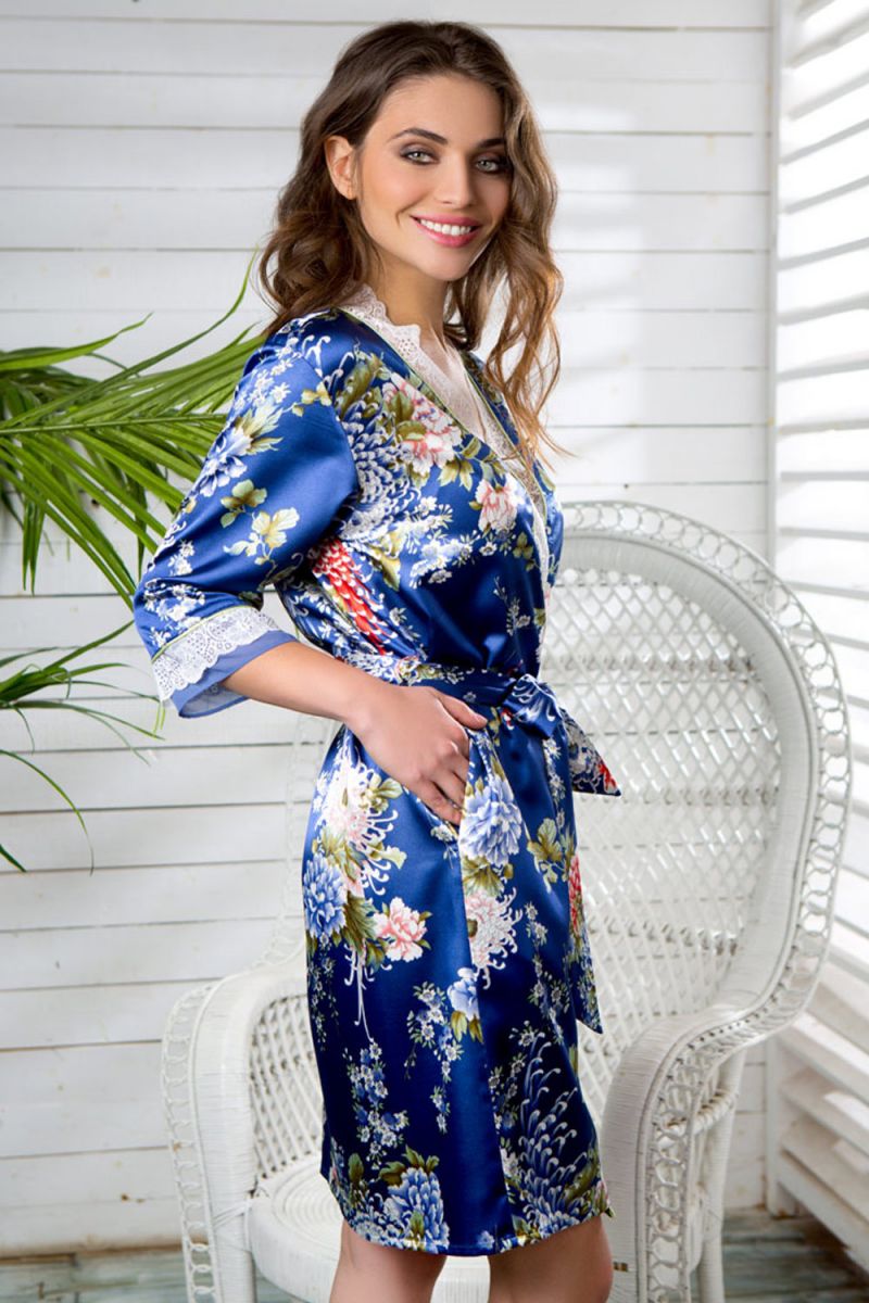 Халат средней длины прямого силуэта из принтованного шелка-сатина. Воротник - шалька, выполнен из кружевного полотна. Рукава втачные 3/4 с манжетами из однотонной ткани и декорированные кружевом. Халат завязывается на пояс и на внутреннюю завязку, в боковых швах карманы.
